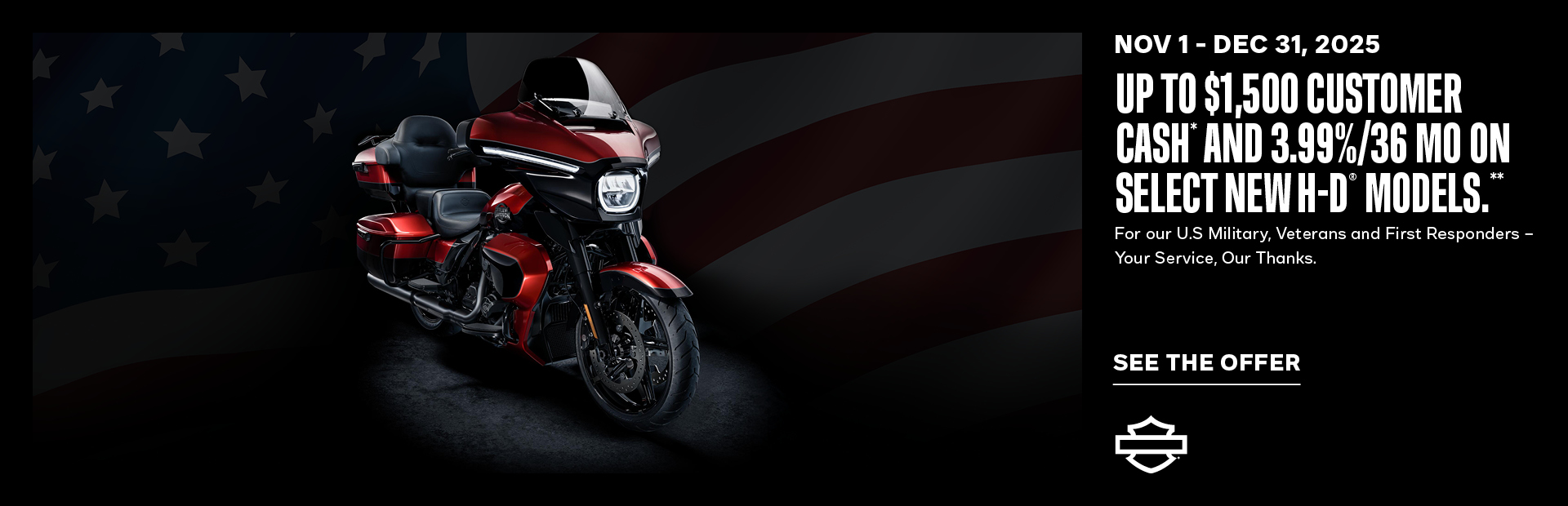 *$1,000 incentive valid towards the purchase price of select new, untitled Street Glide and Road Glide motorcycles, $1,500 incentive valid towards the purchase price of select new, untitled Street Glide Ultra motorcycles, or $750 incentive valid towards the purchase price of select new, untitled Pan America 1250 Special motorcycles, all available and in stock at participating H-D dealers in the continental U.S. including Hawaii and Alaska. At participating dealers only. Eligible customers must visit H-D.com/Military or H-D.com/firstrespondersoffer and validate through the ID.me button to receive H-D Hero code. This promotional offer is valid for the named party only and is non-transferable. Offer valid on purchases made on and between October 1, 2025 to December 31, 2025. Offer cannot be used towards the down payment on a motorcycle. Limit one offer per eligible customer and per eligible motorcycle purchase per year. Offer not valid on previous purchases or future motorcycle orders after December 31, 2025. Please see your authorized Harley-Davidson dealership to determine what offers, discounts or promotions, such as Harley-Davidson finance offers, can be combined with this Offer. The unique ID.me H-D Hero Offer code must be presented at time of purchase to be eligible. Harley-Davidson and/or dealer are not responsible for lost or stolen offers.  Offer is subject to change at any time without notice. Void where prohibited or restricted by law. Cannot be redeemed for cash or cash equivalent and is non-refundable.